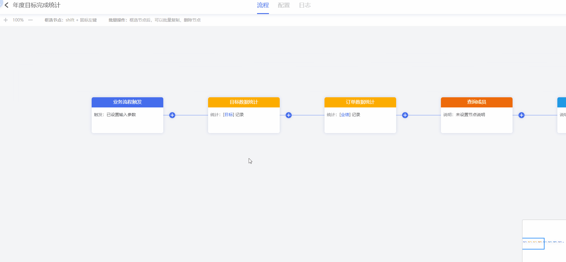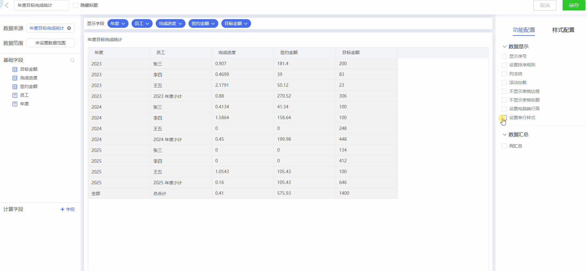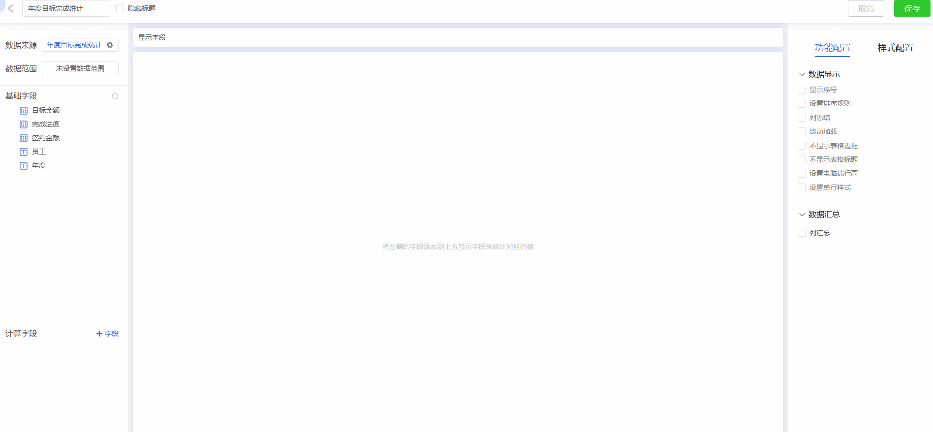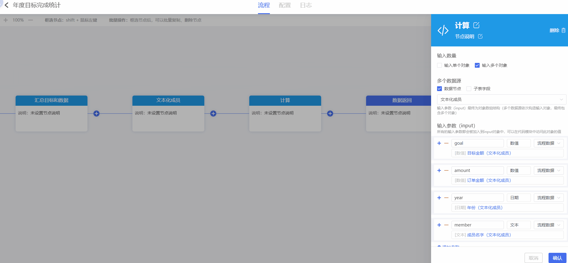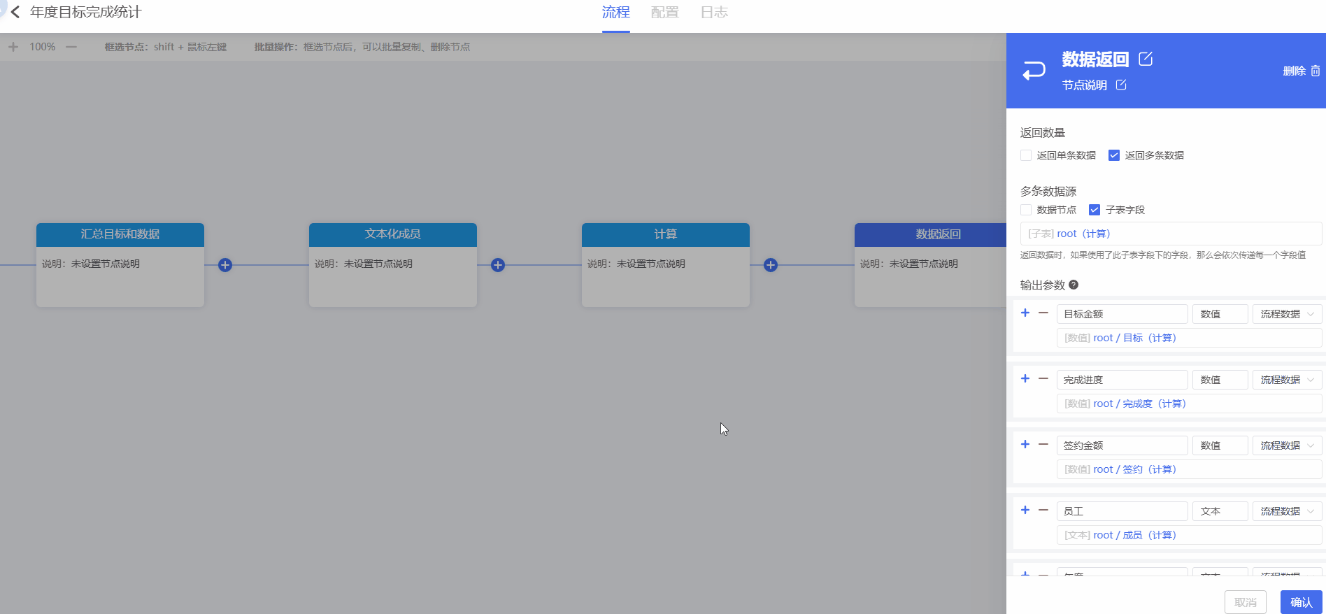 - 连接数据源: 选择前面用数据统计节点查询到的 年度目标和订单数据,并包含所有字段