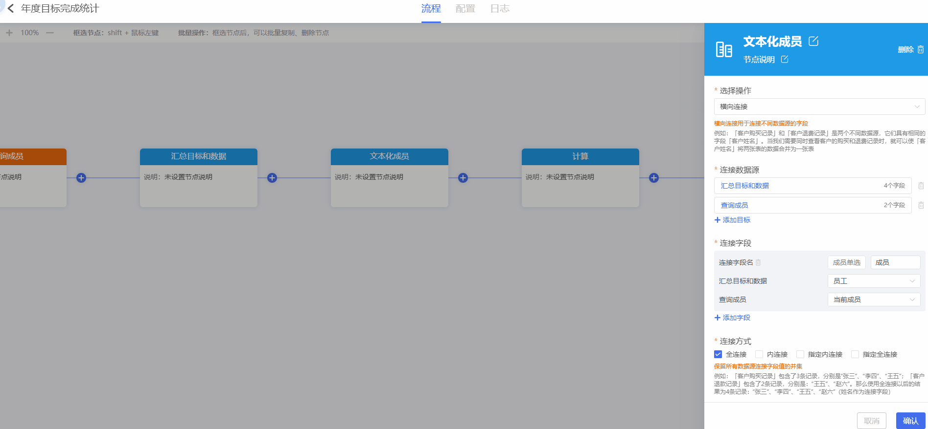 - 连接数据源: 选择上一步数据工厂返回的表单和查询成员节点返回的数据,并包含所有字段