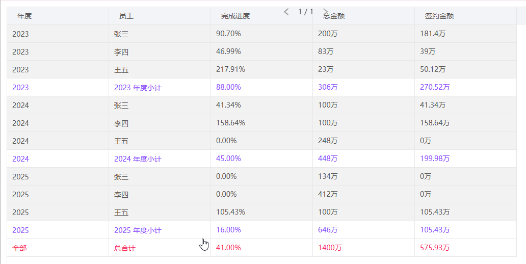 最终返回统计数据: 成员名字、目标金额、签约金额、年度、完成度