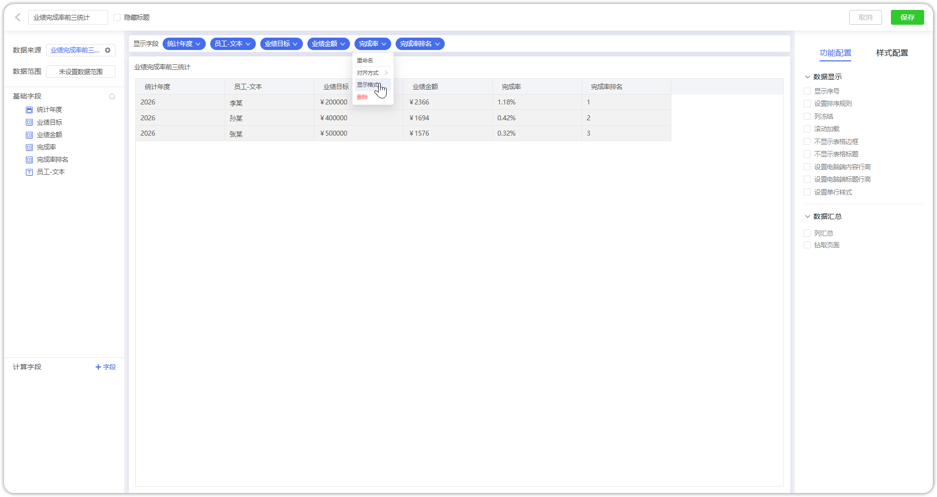 设置返回参数,根据业务需求增加表示【完成率】、【排名】等字段的参数。