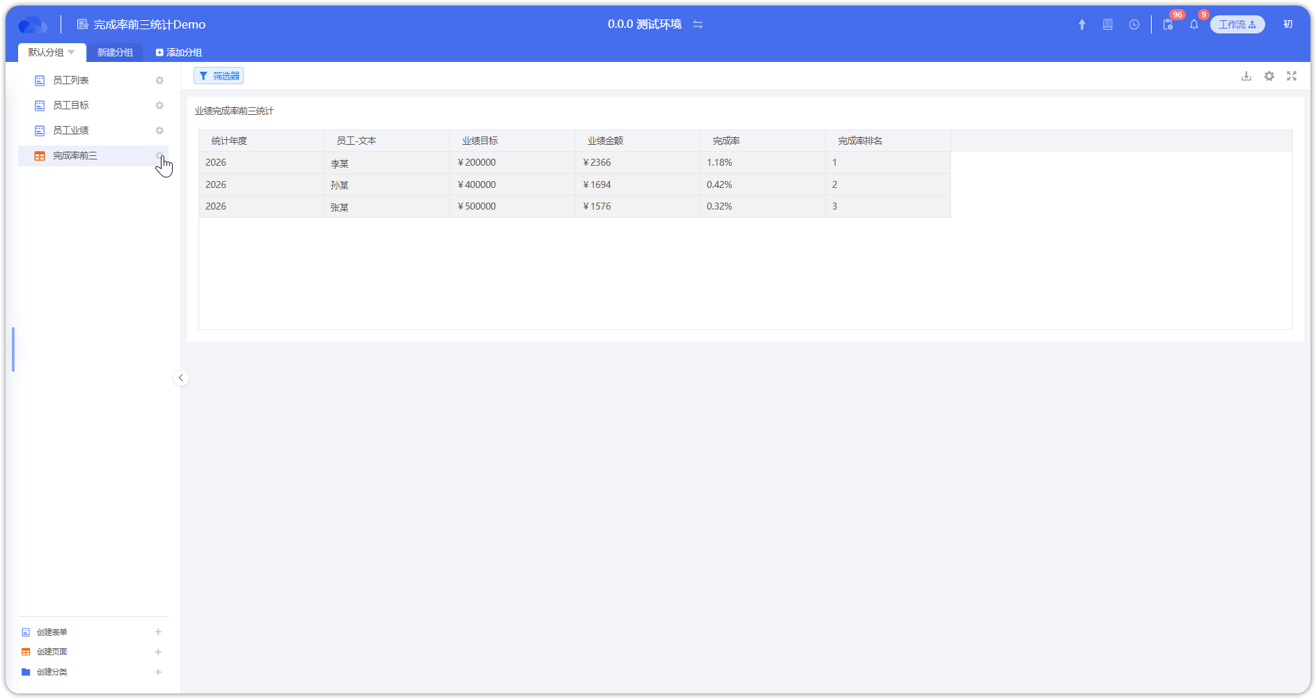 根据员工的【年度业绩目标】、【业绩详情】等不同表单的数据来源,计算目标完成率并取前三进行数据统计。