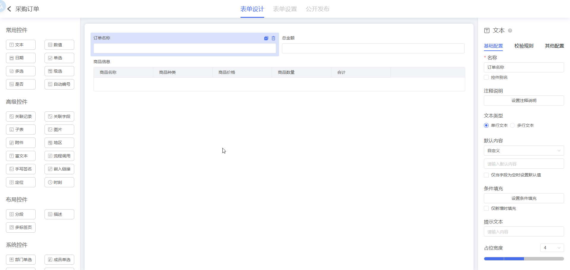创建采购订单,包含订单统计信息和一张存放商品信息的子表: