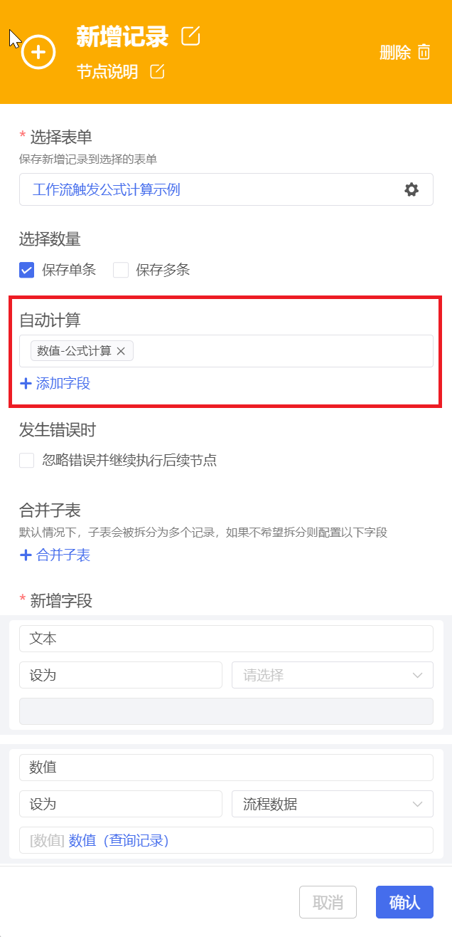 默认当新增记录节点发生错误时,将中断所在分支执行。如果需要忽略错误并继续执行,则可以启用选项忽略错误并继续执行后续节点
