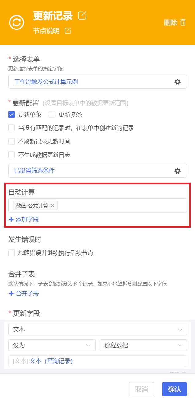 节点功能:更新目标表单中筛选范围内记录的数据