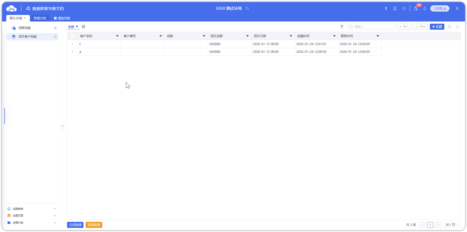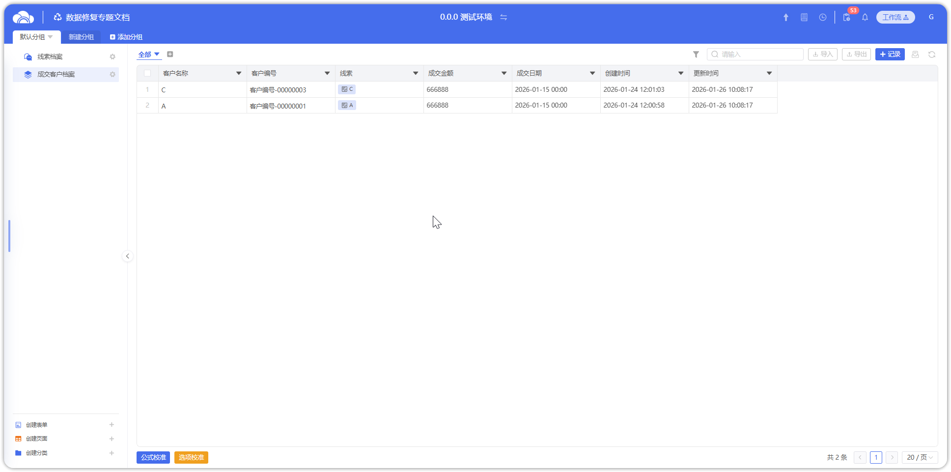 对【线索档案】和【成交客户档案】两个表单,按照【客户名称】进行匹配对应,相同名称的记录视为代表同一个客户,存在数据修复需求如下: