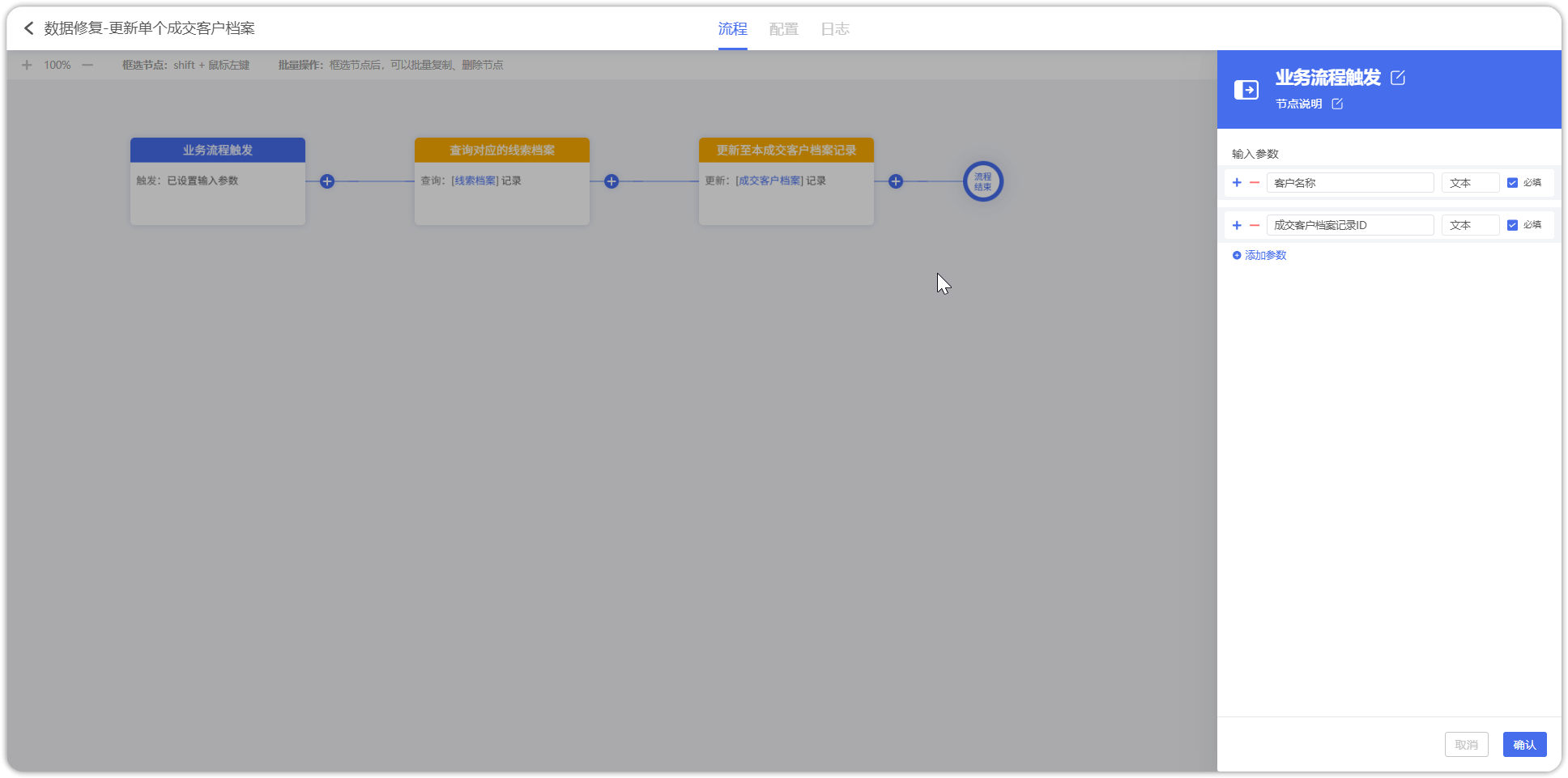 设置业务流程,用于对单条【成交客户档案】记录进行数据修复。