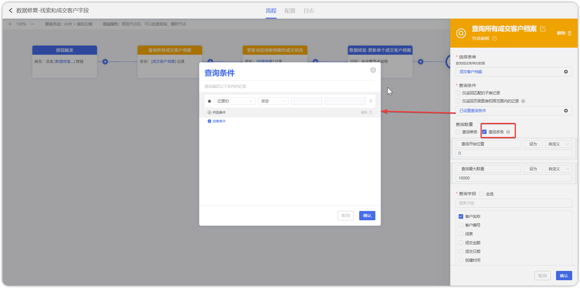 设置查询记录节点,选择表单设置【成交客户档案】;