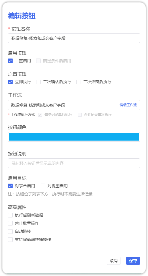 新建一个表单,并在其中添加功能按钮,工作流执行方式选择每条记录单独执行,启用目标选择对表单启用。