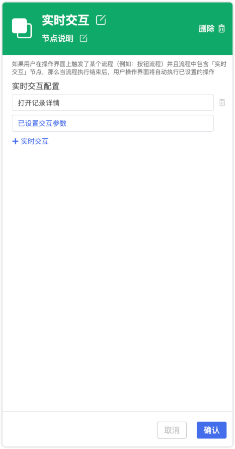 当用户触发了某个流程(例如:按钮流程),如果流程设置了实时交互,则当流程执行结束后将自动执行已设置的交互动作