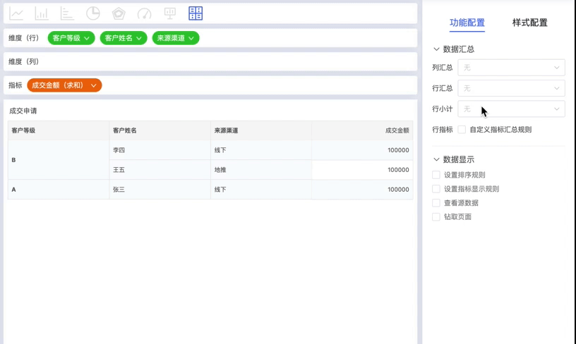 支持对行小计、行汇总的指标设置自定义的汇总规则